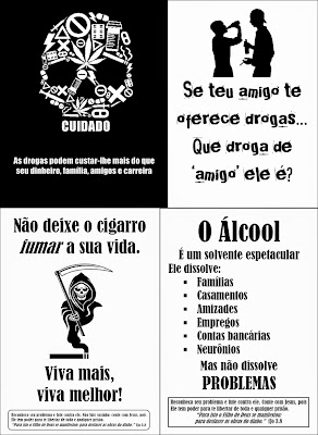 Cartazes contra o uso de drogas e álcool - Série de seis cartazes simples, em tamanho A4 e em preto-e-branco, com mensagens de combate ao uso de drogas, álcool e cigarro. Para tal, valemo-nos tanto da criação 'pura' como da adaptação de materiais/mensagens já disponíveis na internet, como a mensagem sobre o álcool solvente, ou o cartaz da caveira formada por drogas, que é um cartaz do artista americano Jude Landry, e que nós traduzimos. São materiais ideais para você imprimir e tirar cópias, e espalhar por sua comunidade, e em murais de escolas, faculdades, empresas etc. Outra dica: note que os cartazes sobre álcool e cigarro possuem dois modelos de cada um: em um está inserida uma pequena mensagem evangelística, e no outro não, para que ele possa ser veiculado em locais onde é proibida ou mal recebida a mensagem religiosa.